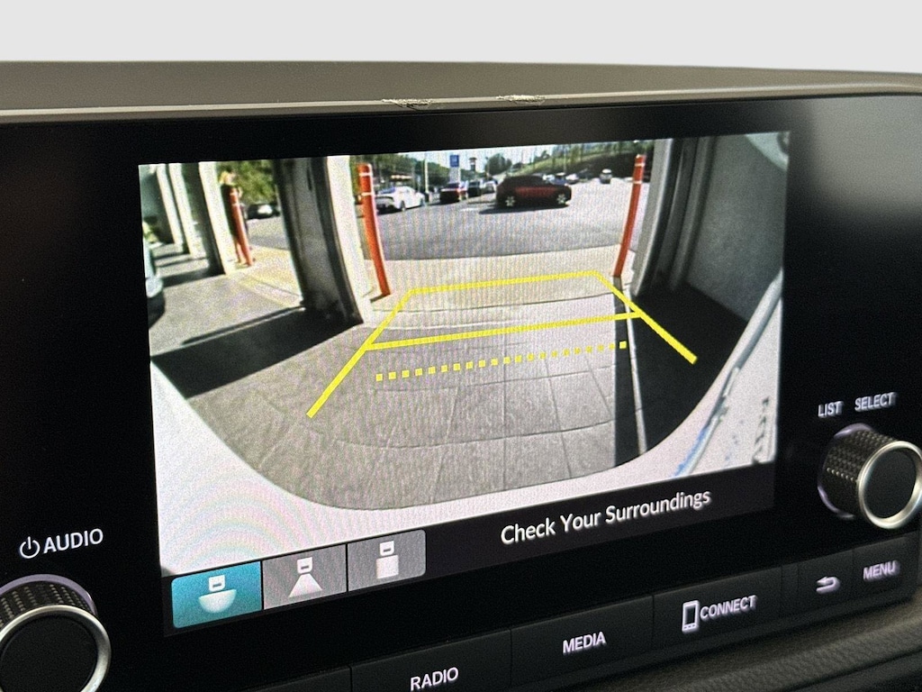 - The vehicle is equipped with a camera that displays an image of the area behind the vehicle on an interior display.